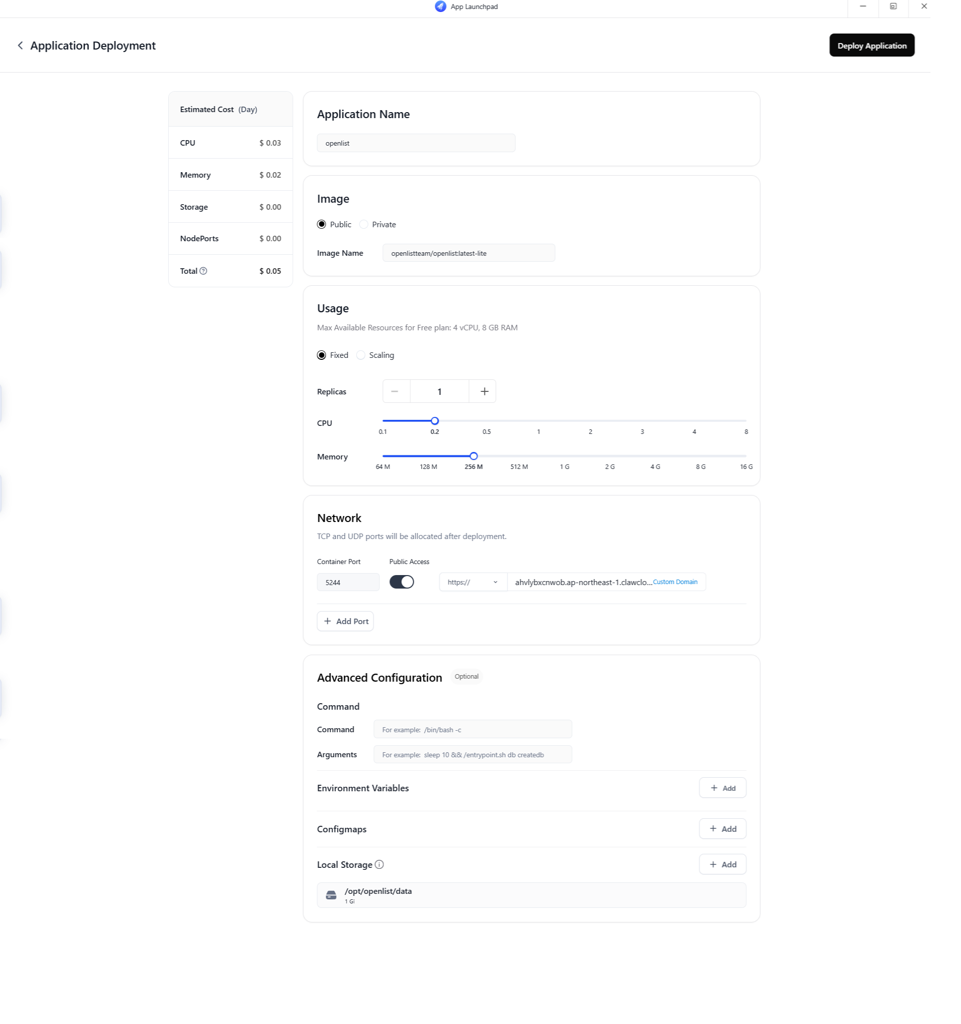 Image | openlistteam/openlist:latest-lite | Image, please make sure to use the one with lite, otherwise the error Pod ephemeral local storage usage exceeds the total limit of containers 100Mi. may occur |
